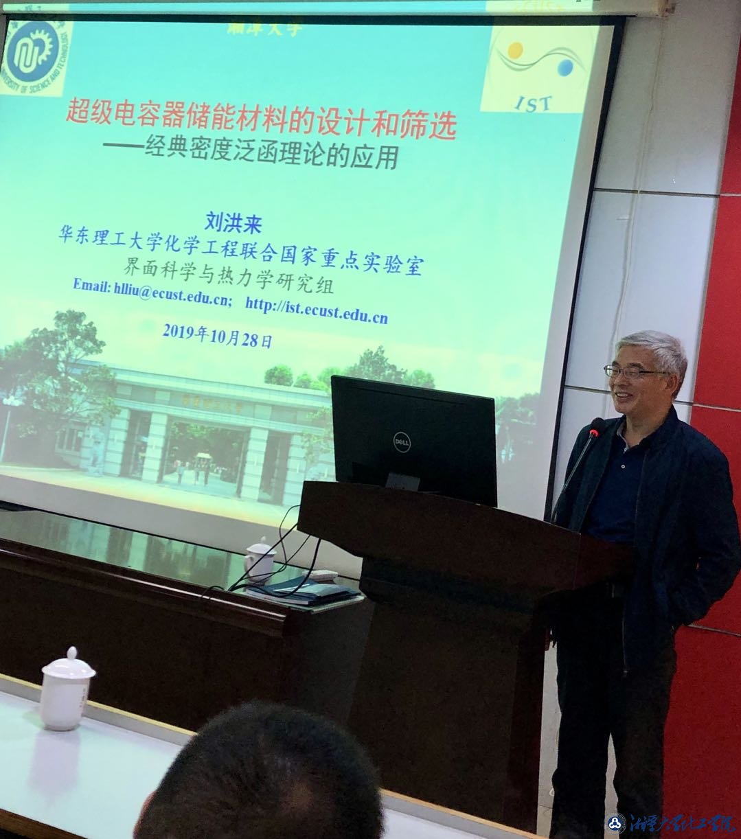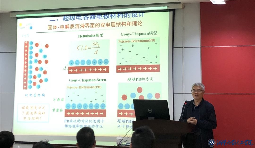 刘洪来教授此次报告的课题为超级电容器储能材料的设计和筛选。主要从超级电容器的储能原理、电极材料的设计、电解质的筛选以及密度泛函理论四个方面展开了介绍。在面对可再生能源的不稳定储存转化等问题上,通过将其转化为化学燃料电池变成稳定的能源,从而提高了对可再生能源的利用。此研究为推动社会的发展提供了强大的力量。在这一过程中,充分体现出了刘洪来教授对科学研究的热忱,对实验的严谨态度以及他深厚的理论依据。