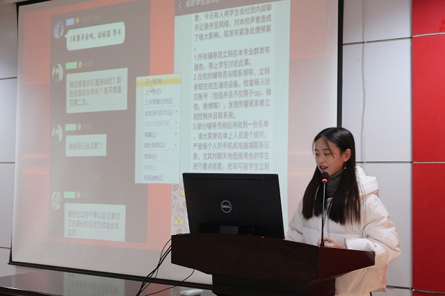 12月16日晚上7时,化工学院第十八届团委学生会干部培训在化学化工大楼A208顺利举行。本次培训由校团委助理团办公室主任卢甜主讲,参加培训的人员有第十八届团委学生会主席团成员以及所有部长级成员。