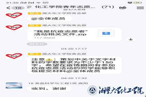 4月20日下午,在下发活动通知后,志愿者们积极参与,上交材料,详细记录活动过程,认真书写抗击疫情活动的心得,字里行间处处彰显着青年人不怕苦,不怕累的担当精神。