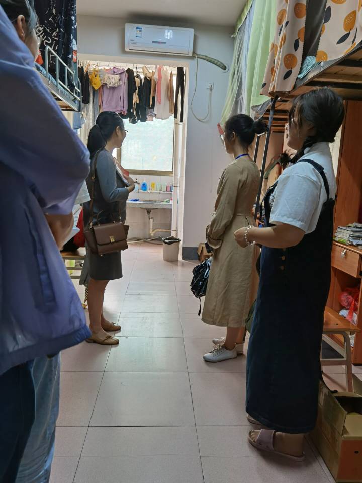 周书记与夏老师跟随日常管理部成员依次前往了各个寝室,同学们都非常热情。在大一女生寝室里,夏老师亲切地与同学们交谈,询问最近学习生活等方面的情况,对各个寝室的卫生进行了点评。夏老师叮嘱同学们一定要注意寝室环境的卫生和美观,提出了保持通风,吃完的食物要及时处理等建议。除此之外,同学们认真地向夏老师介绍自己寝室的特色,包括寝室装扮,日常生活以及各自的学习方法。在大四男生寝室里,周书记与夏老师非常关心毕业生的毕业情况,热切地询问毕业论文是否完成,实习的企业是否找好等问题。