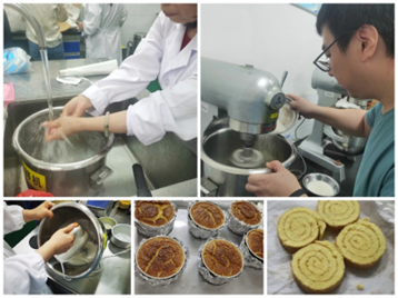 活动第三项,与会党员在车书记的带领下参观了生物与食品工程系的重点实验室,之后与会人员亲自体验了制作奶酪蛋糕的具体操作过程。车书记也是此次体验活动的指导老师,他首先向各位党员介绍了制作奶酪蛋糕的秘方,很详细介绍了制作过程和制作过程应该注意的事项,然后把与会党员分成四组,每组3—4人,每组党员同志积极地按秘方要求进行选料、称料、配料、制料,车书记不停地在每小组中穿梭作指导,累得他汗流浃背,针对制料失败了的党员同志,就分析他们失败原因,然后和他们一起重作。各位党员同志们的制作热情高昂,看到自己制作出的成品,有的有点小失望,不太令人满意;有的好开心,有点不敢相信这是自己制作出来;有的就分析在哪个过程中应该怎么做会更好……。