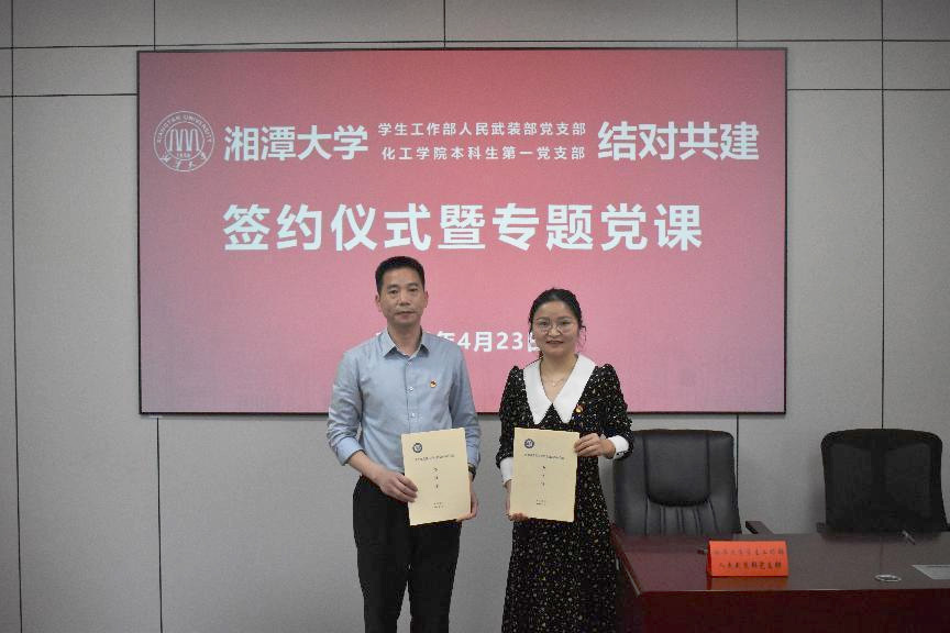 4月23日,学生工作部人民武装部党支部与化工学院本科生第一党支部结对共建签约仪式暨“时刻把纪律刻印在心里”专题党课在化学化工大楼A208举行。副校长刘建平,校纪委副书记、监察专员办公室主任蔡一文,学生工作部部长赵猛,化工学院党委书记陈非文出席,学生工作部人民武装部党支部、化工学院本科生第一党支部全体党员参加本次活动。