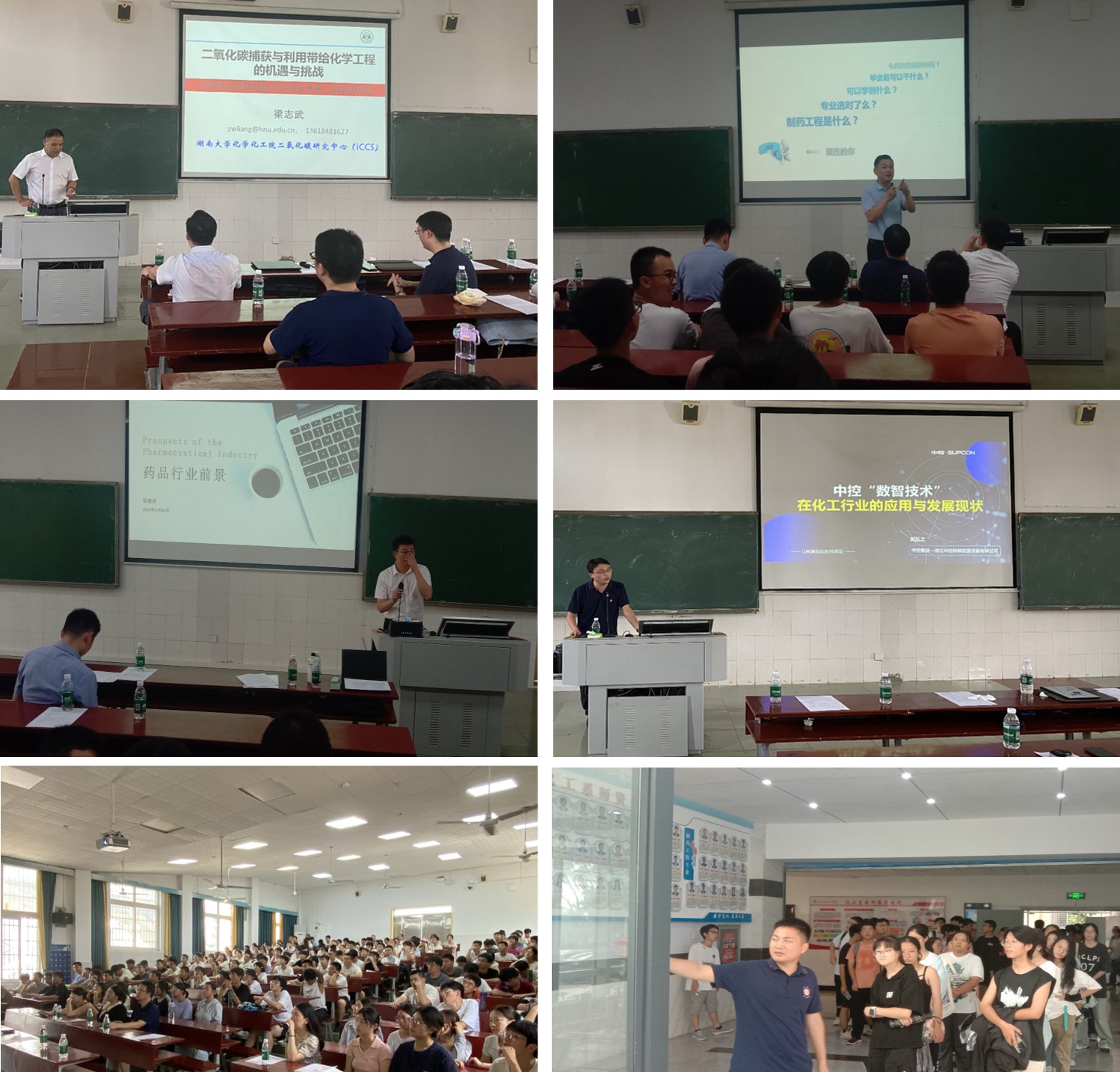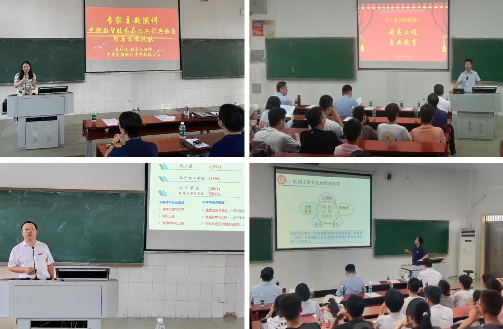 在化学工程与工艺专业主题讲座环节,化工学院副院长郝芳教授担任主持人,化工学院院长游奎一教授、化工系主任张晓文、副主任李正科和2024级新生班主任参加。游奎一教授详细介绍了化学工程与工艺专业在国内行业内的优势和特色,期望同学们在新学期新环境中快速转换角色,争取大学四年取得自己满意的成绩。湖南大学梁志武教授作了题为“CO2捕获与利用带给化学工程的机遇与挑战”的主题讲座,从“碳达峰碳中和”这一国家政策展现了化学工程的发展前景。浙江中控集团奚弘之副总工程师则从“数智技术”方面为2024级新生展现多种专业智能软件在化工行业的应用和发展现状。