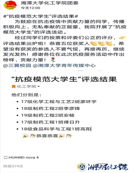 活动通知下发后,同学们踊跃报名、积极参与。首先,由化工学院的老师和学生代表组成的评委团进行评分。评委们认真公正地对待参选者的参评材料,从抗疫服务活动时长、抗疫服务工作量以及工作效果等方面全面地进行评分。