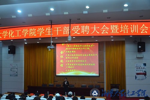 10月20日晚7时,英国365集团公司学生干部受聘大会暨培训会议于逸夫楼第一报告厅顺利举办。莅临本次会议的嘉宾有:化工学院党委副书记周春初书记、团委书记刘宇谦老师、学生工作办公室夏妮老师、郑棉文老师、学生工作办公室兼职辅导员张睿博士、化工学院第十八届团委学生会部分成员及第十九届团委学生会主席团成员。化工学院第十九届团委学生会团委第一副书记沈孝娟担任主持。