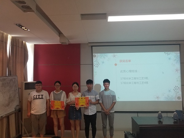 接下来进行颁奖仪式,心理健康与权益保障部李琦荣获优秀心理工作者,16级化学工程与工艺一班谢金波、17级化学工程与工艺三班黄雪纯以及17级化学工程与工艺四班殷睿智荣获校级优秀心理委员,16级制药工程二班曾俊、17级化学工程与工艺三班马立津、17级化学工程与工艺四班肖悦荣获院级优秀心理委员,17级化学工程与工艺三班、17级化学工程与工艺四班荣获优秀心理班级。