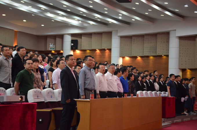 会议开始,由学生代表进行诗朗诵——《湘大之恋》,而后全体人员观看了2017年度团委工作汇报视频。视频观看完毕,全体起立,奏唱团歌;并由青年代表程安琪同学带领宣誓。
