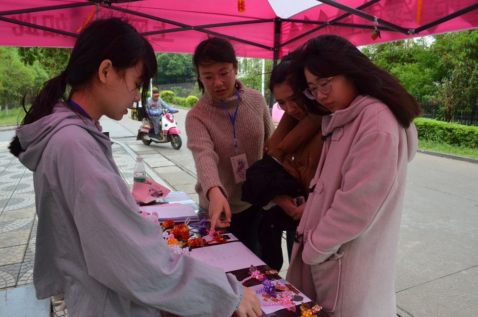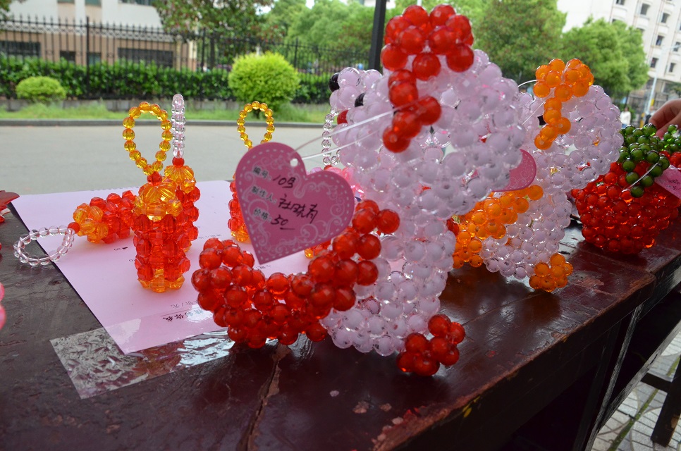 本次活动义卖的手工艺品全都出自湘潭市福利院所救治的小朋友、大朋友之手,蜻蜓、苹果、草莓等由彩色珠线串成的手工艺品形态各异。东西虽简单,但对孩子们来说仍有难度。