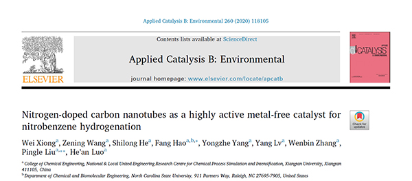 今年1月,刘平乐教授团队在催化领域顶级期刊连续发表了2篇论文。“氮掺杂碳纳米管无金属加氢催化剂高效催化硝基苯加氢反应(Nitrogen-doped carbon nanotubes as a highly active metal-free catalyst for nitrobenzene hydrogenation)”发表在《应用催化B》(一区TOP期刊,影响因子为14.229),第一作者是熊伟副教授,通讯作者是刘平乐教授。该成果通过杂原子改性得到碳纳米管非金属催化剂,因不含金属组分但却拥有媲美金属的加氢催化性能,具有极大的研究意义和环保价值。“疏水改性核壳MOFs纳米反应器中肉桂醛转移加氢制备肉桂醇:金属-N键作为活性位点的识别(Transfer hydrogenation of cinnamaldehyde to cinnamyl alcohol in hydrophobically modified core–shell MOFs nanoreactor: Identification of the formed metal–N as the structure of an active site”)在《催化学报》(一区TOP期刊,影响因子为7.723)上发表,第一作者是博士研究生崔海帅,通讯作者是刘平乐教授和熊伟副教授。该研究成果与现有催化剂相比,在大大降低生产成本和避免使用碱性添加剂的条件下,实现了高效的制备肉桂醇,符合绿色催化的原则。
