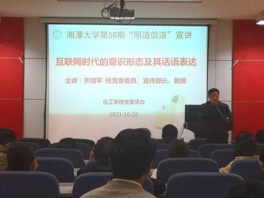 2021年10月26日,化工学院党委在化学化工大楼A208学术报告厅承办了学校第58期“明道信道”师德师风建设宣讲会。校党委委员、宣传部部长齐绍平教授应邀作了题为“互联网时代的意识形态及其话语表达”宣讲报告。学院全体教职工参加会议,院党委书记陈非文主持。