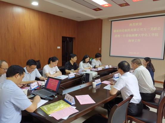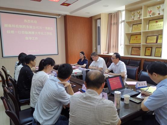 湖南科伦制药有限公司副总经理万一龙先生介绍了湖南科伦制药有限公司历史、生产规模、研发中心等情况。湖南科伦制药有限公司是一家专业生产大输液的现代化制药企业,位于岳阳县生态工业园,公司共有员工2600余人,拥有大容量注射剂、胶囊剂、片剂、颗粒剂、粉针剂、喷雾剂、小容量注射剂等九大剂型、127个品种、244个规格的中西药产品。是中南地区药品剂型、品种最为齐全的综合性制药企业。万一龙表示湖南科伦高度重视储备人才的引进和培养,诚挚希望通过本次交流洽谈,探索校企在实践教学基地建设、科学研究、大仪共享、人才互聘等方面展开深度和广度的合作。