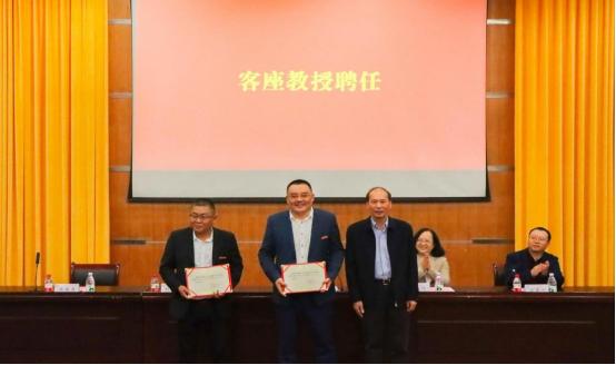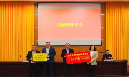 随后,在会场热烈的掌声中,柯盛新材柳雄策董事长、郑保昌副总经理为学校现场捐赠柯盛新材奖学金”50万元,校长李伯超教授、副校长葛飞教授共同为柯盛新材颁发了柯盛新材奖学金捐赠牌匾。同时,为进一步充分利用校企合作优势,提升人才培养质量,学校还聘请柯盛新材柳雄策董事长、郑保昌副总经理为湘潭大学客座教授,李伯超校长现场颁发了聘书。