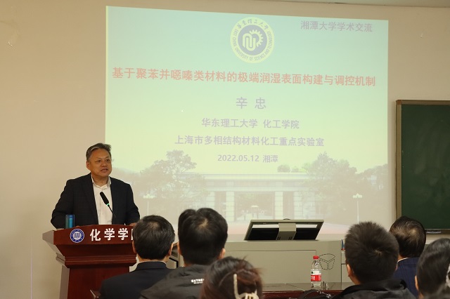辛忠教授以“基于聚苯并噁嗪类材料的极端润湿表面构建与调控机制”为主题,基于聚苯噁嗪类材料的论点中心,向外不断发散,讲述了自己多年来开展的科学研究工作。辛教授在材料化工、低碳化工和微化工的方面的研究及成就无不令人心生崇敬。
