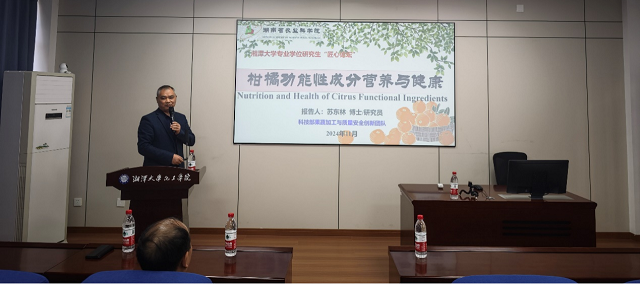 为推进专业学位人才培养质量的不断提升,拓宽研究生对行业领域的认知视野,提升职业素养,2024年12月3日下午3点,英国365集团公司特邀湖南省农产品加工研究所副所长、湖南省食品测试分析中心副主任苏东林做客“专业学位研究生匠心论坛”,作题为“柑橘功能性成分营养与健康”的学术报告,由化工学院副院长、食品科学学科带头人陶能国教授主持。
